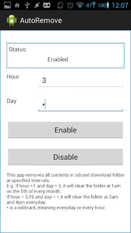This app automatically clears the /sdcard/Download folder at specified intervals. This is the folder which stores all files you have downloaded from your browser and usually gets cluttered over time. Do not store important files in the location if you choose to enable the app. I will not be responsible for any lost files.