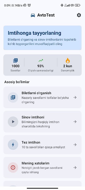AvtoTest sizga O'zbekistonda haydovchilik imtihoniga tayyorlanishda yordam beradi. Yo'l harakati qoidalarini o'rganing, 1000 dan ortiq savollarda mashq qiling va istalgan vaqtda — hatto internetsiz — sinov imtihonini topshiring.