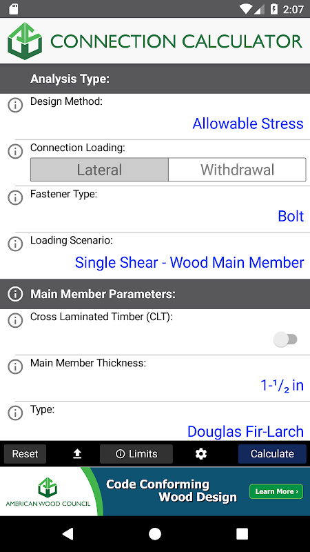 · Kalkulator Koneksi online tidak menangani pengencang yang dipasang pada sudut ke butiran (mis. Kuku jari kaki). Lihat NDS Bab 10-11 untuk ketentuan desain yang berlaku.