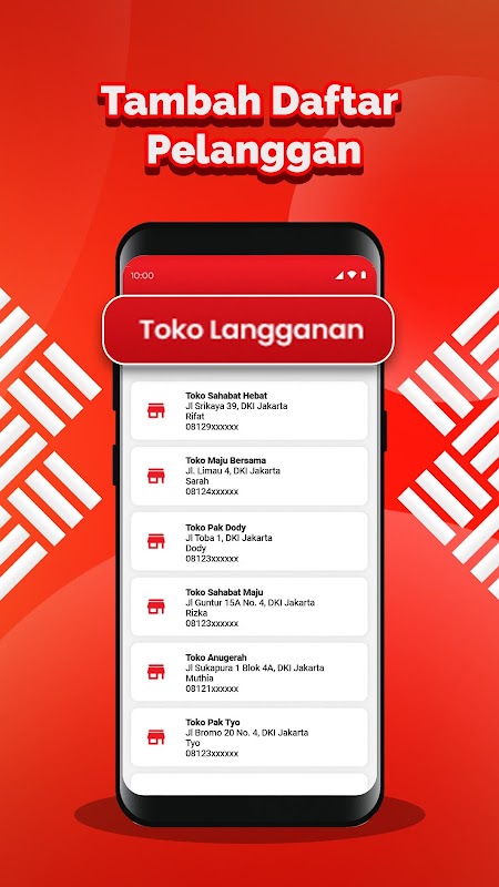 - Simpan data pelanggan (nama toko, nama pemilik, no telepon, alamat) di aplikasi, mudahkan salesman toko kunjungi pelanggan