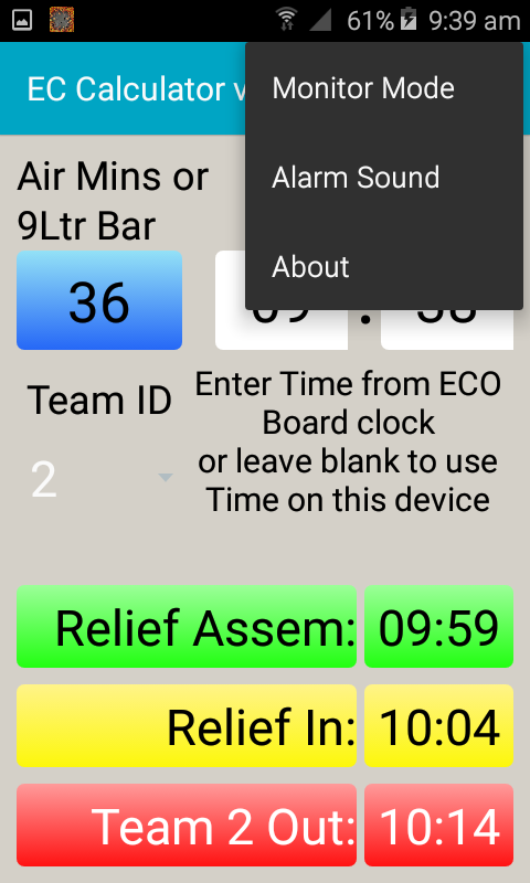 5. Tap the CALCULATE button - This timer is now running. The Air Mins field will change colour and sound an alarm when reaching each of the 15,10 and 1 minute markers. Each active timer can be displayed by changing the Team selection.