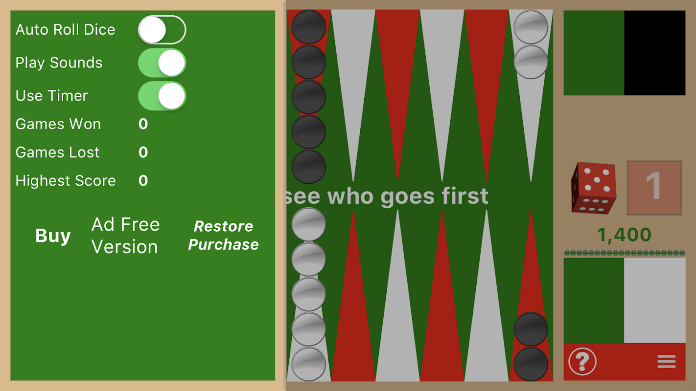 Bidak permainan backgammon umumnya dikenal sebagai dam atau pip. Tujuannya adalah untuk menghilangkan (menghilangkan) semua dam Anda sendiri dari papan sebelum lawan Anda dapat melakukan hal yang sama. Di awal setiap permainan, dam diatur ke posisi yang telah ditentukan sebelumnya. Saat permainan berlangsung, mereka mungkin diblokir atau dipukul oleh lawan. Untuk memulai permainan baru, sentuh tombol permainan baru. Setiap kali Anda memainkan permainan baru, 100 poin dikurangi dari skor Anda.
