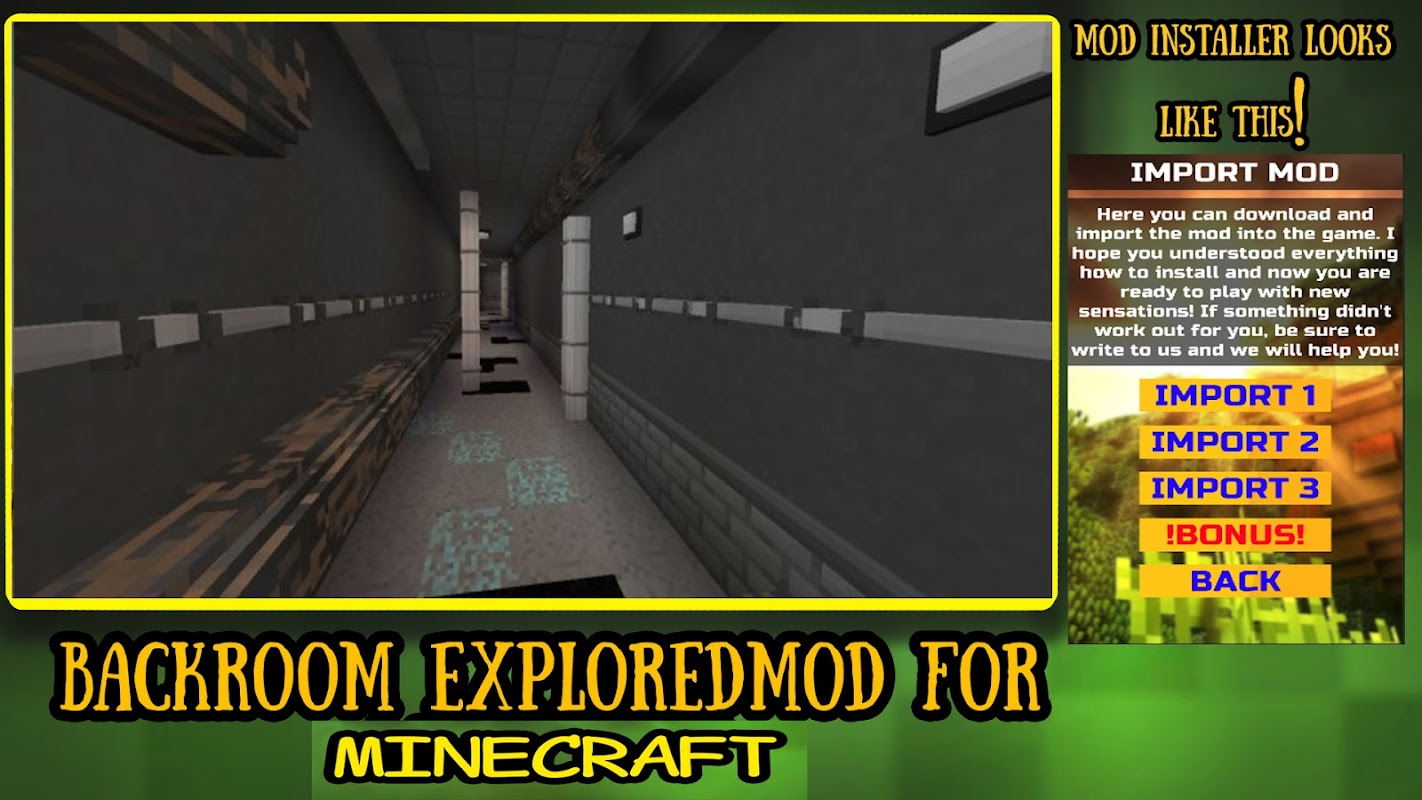 Bayangkan Anda berada di ruangan kuning yang luas. Anda keluar dari sana dan menemukan diri Anda dalam warna koridor yang sama dengan banyak orang lain di ruangan yang sama. Bau karpet basah menghilang ke dalam hidung, dan pencahayaan terus-menerus berkedip. Anda mulai menjelajahi ruangan di belakang ruangan, tetapi Anda tidak menemukan apa pun, seperti meninggalkan mimpi buruk ini. Tapi tiba-tiba kamu mulai mendengar kehadiran seseorang... Kedengarannya menakutkan bukan? Suasana inilah yang dapat dibuat dengan mod BackRoms di MCPE.