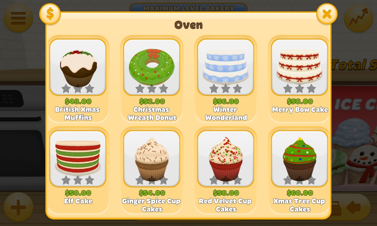 Pelangganmu selalu mencari item baru bertema Natal di toko rotimu, jadi jangan lupa untuk memanggang dan menyimpan semua item makanan baru yang kamu buka di setiap level!