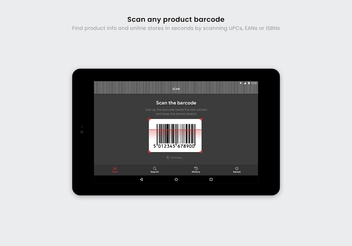 • Pindai kode batang apa pun (UPC, EAN, ISBN atau GTIN) untuk menampilkan detail produk dalam hitungan detik