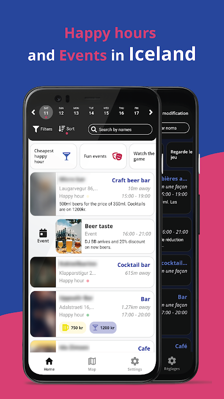 Lihat seluruh kota dalam sekejap! Peta pintar kami menunjukkan bar mana yang buka, tutup, sedang mengadakan acara, atau sedang happy hour. Ini adalah cara tercepat untuk mengetahui lokasi dan menemukan tempat.