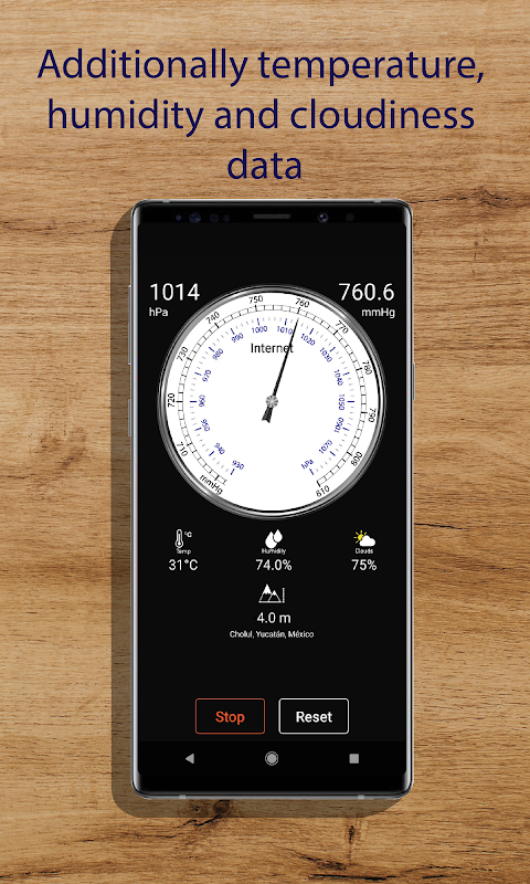 Barometer mengukur tekanan atmosfer secara real-time menggunakan sensor tekanan perangkat, dan juga mendapatkan pengukuran ketinggian menggunakan GPS. Jika perangkat TIDAK MEMILIKI SENSOR TEKANAN, aplikasi akan mendapatkan data tekanan dari internet. Selain itu, juga akan mendapatkan data suhu, kelembapan, dan kekeruhan.