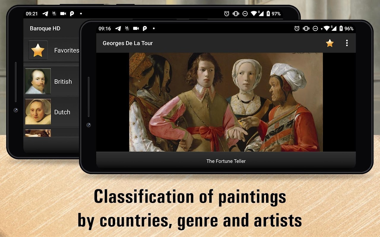 Aplikasi ini berisi koleksi besar 1149 lukisan dari 100 seniman yang berbeda - termasuk Michelangelo Merisi da Caravaggio, Peter Paul Rubens, Anthony van Dyck, Rembrandt van Rijn dan banyak lainnya.