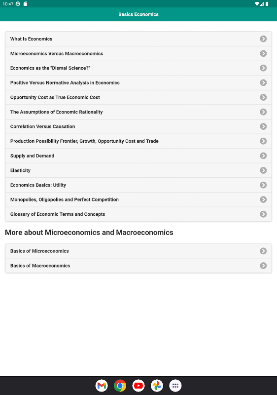 Ekonomi peduli dengan produksi, distribusi, perdagangan, dan konsumsi barang dan jasa baik secara individu maupun kolektif. Dua jenis ekonomi utama adalah ekonomi mikro dan ekonomi makro. Basic Economics adalah aplikasi praktis dan siswa aplikasi yang menyenangkan yang belajar Ekonomi. Aplikasi ini berisi informasi penting tentang Ekonomi. Ini akan berfungsi sebagai referensi saku dan membantu Anda untuk cepat melihat istilah dan definisi kapan saja Anda inginkan.