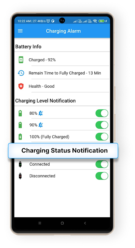 Aplikasi ini memberi tahu Anda ketika baterai Anda terisi penuh. Anda juga dapat memilih level baterai untuk mendapatkan alarm dengan pengumuman suara.