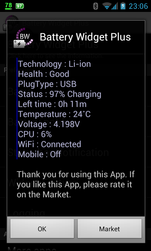 BatteryWidget shows an exact battery level on the status bar, health, temperature, voltage, CPU usage.