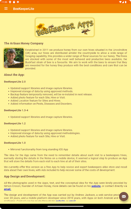 Selamat datang, BeeKeeperLite adalah ide dari pemilik Artisan Honey Company yang berbasis di Lincoln, Inggris. Aplikasi ini telah diwujudkan oleh Andrew Jackson, Pemilik Interneers a Web Hosting dan App Dev Company, juga berbasis di Inggris.