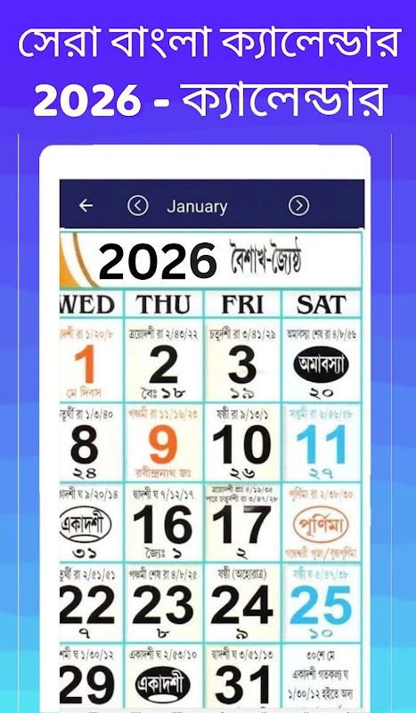 Kalender Bengali baru yang berisi semua kalender Bengali 1431 - 1430 / 2026 - 2025 dan Panchang Bengali 2026 - 2025. Kalender ini sangat berguna bagi penutur bahasa Bengali, juga dikenal sebagai Kalender Bangla 2026 - 2025 & 2026 - 2025. Kalender Bengali 2026 - 2025 menyediakan semua kalender penting dan Panjika 2026 - 2025 dengan detail puasa yang akurat. Aplikasi ini sangat berguna untuk informasi festival dan hari libur.