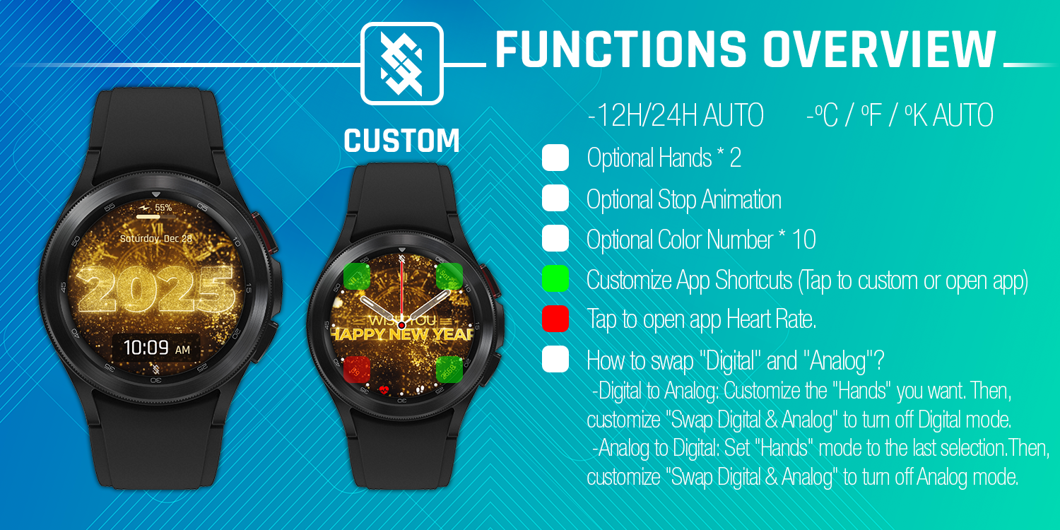 - Informasi kesehatan: Jumlah langkah, Detak jantung (hanya dalam mode Analog)