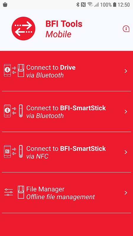 Beijer BFI Tools Mobile adalah Aplikasi Smartphone yang intuitif dan mudah digunakan yang menyediakan konfigurasi nirkabel dan pemantauan rangkaian produk BFI. Pengoperasian nirkabel dilakukan melalui Bluetooth BLE dan tersedia di BFI mana pun saat BFI-Smartstick dicolokkan ke drive atau jaringan drive.