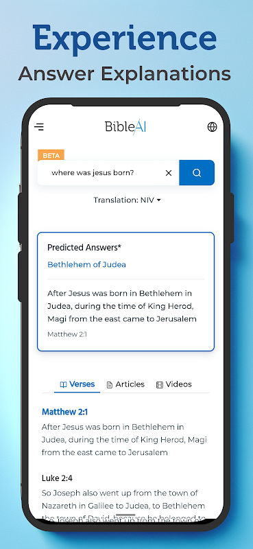 Dengan Bible AI, Anda dapat mencari Alkitab menggunakan pertanyaan bahasa alami dan mendapatkan jawaban yang akurat dan dapat diandalkan dari kitab suci; serta artikel dan video. Anda juga dapat membaca Alkitab dalam konteks, tanpa gangguan. Bible AI lebih dari sekadar mesin pencari, ini adalah platform di mana Anda dapat berinteraksi dengan firman Tuhan dan bertumbuh dalam iman Anda.