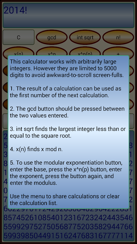Tool for big integer calculations. Arbitrarily large integers can be used, and results can be arbitrarily large. Menu options allow initial limit of 5000 digits to be increased.