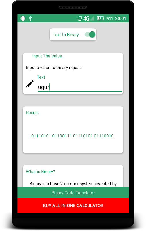 You can use this free app for Translate Binary Code to String(text) or String(text) to Binary Code...