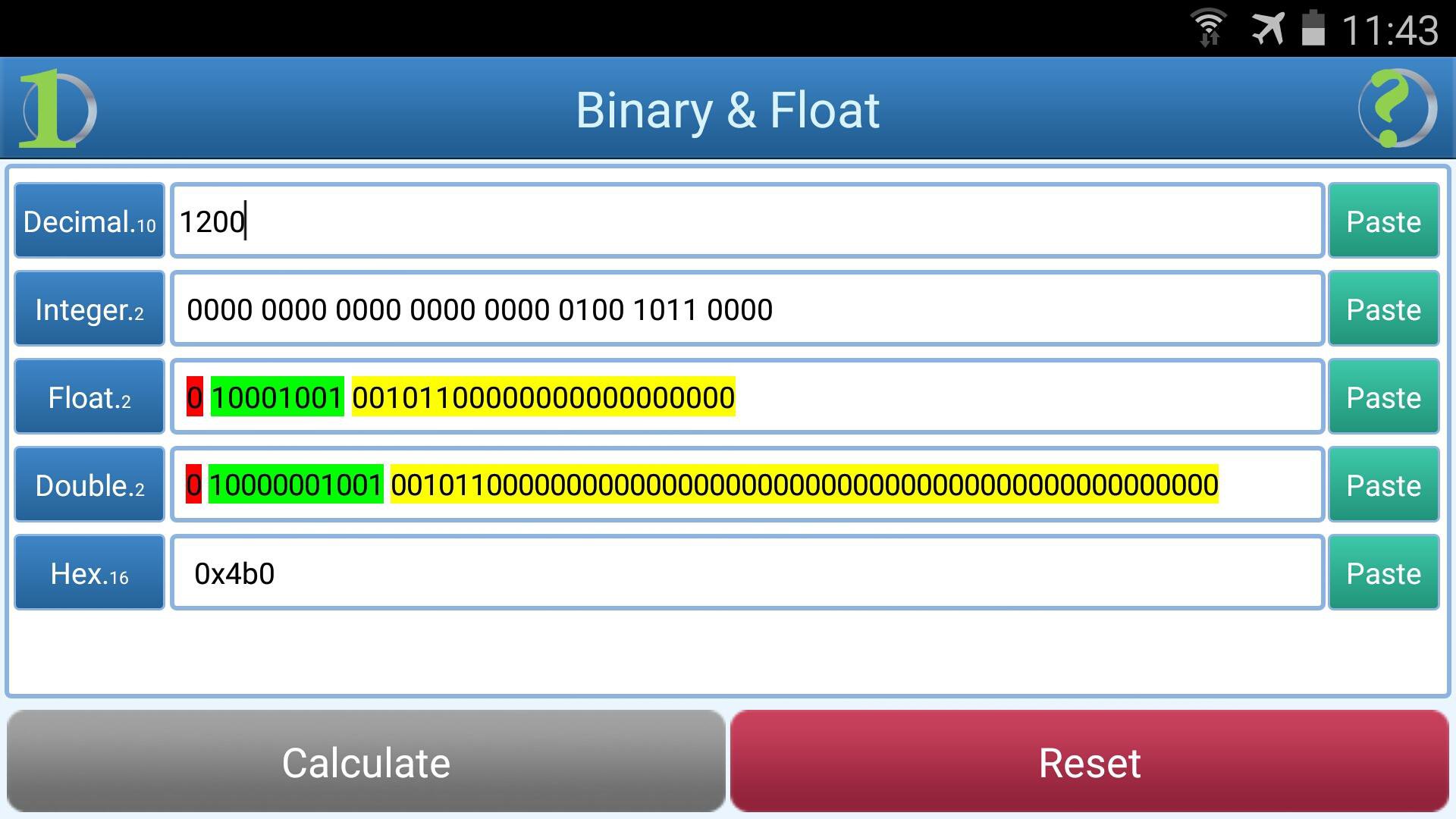 Binary & Float is a tool for all-the-way conversion of numeric digital representations. It converts Decimal and signed binary Integer (32bit), Float (32bit), Double (64bit) and Hexadecimal representations.