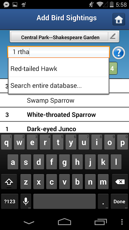 -- Enter birds quickly and easily as you see them using bird codes or full names