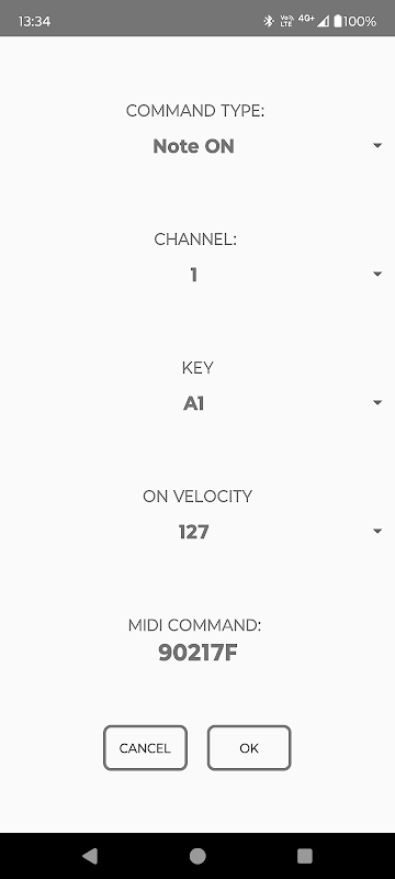 – Kenop – tetapkan pesan MIDI utama, dengan aplikasi mengirimkan nilai dari minimum hingga maksimum berdasarkan posisi kenop untuk kontrol dinamis. - Kirim perintah MIDI dan SysEx