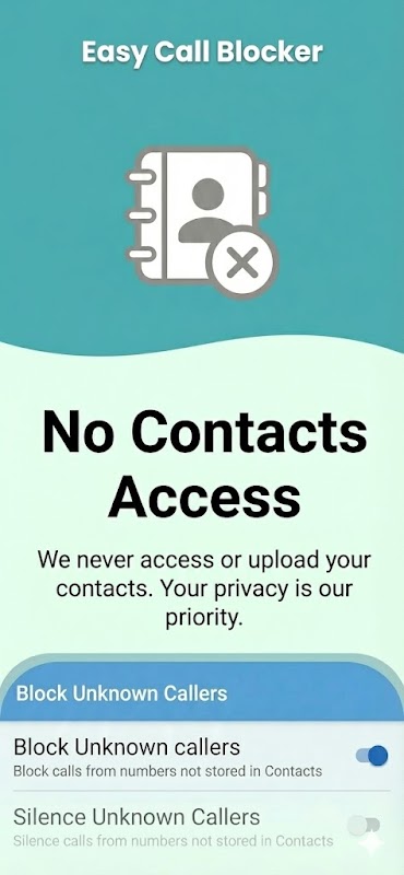 Berbeda dengan aplikasi lain yang meminta izin berlebihan dan mengumpulkan data Anda, Easy Call Blocker dibangun berdasarkan prinsip minimalisme dan privasi. Aplikasi ini melakukan satu tugas dengan sempurna: menjaga ponsel Anda tetap tenang.