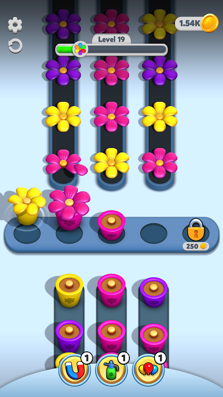 Pindahkan vas dalam urutan yang benar dan kumpulkan bunga berwarna-warni di Bloom Jam!