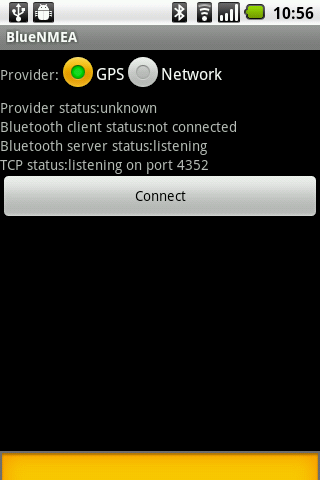 BlueNMEA is an Android application which sends location data over Bluetooth (RFCOMM) or TCP in the NMEA format.