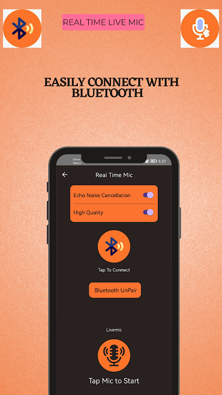 Mikrofon langsung akan membuat ponsel Anda benar-benar seperti mikrofon dan mikrofon pengumuman.. Ini mengubah suara Anda dengan volume tinggi seperti pengeras suara, cukup sambungkan Speaker Bluetooth atau Kabel Aux.