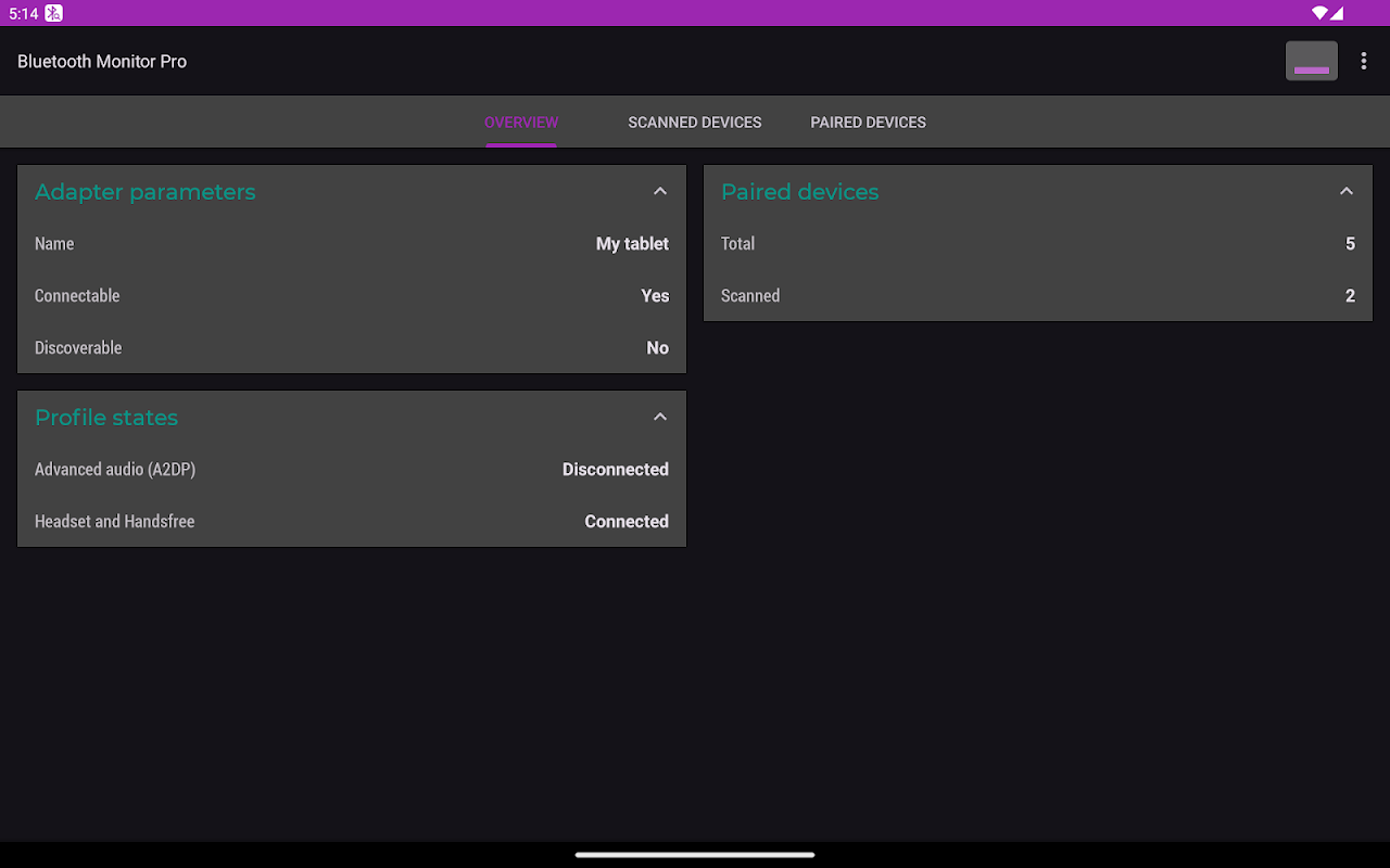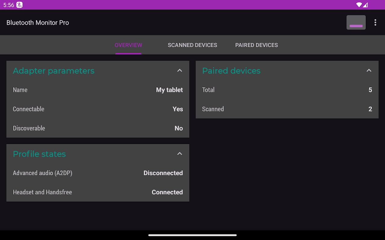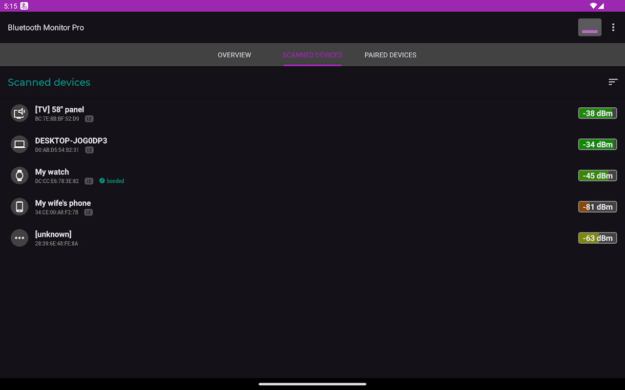 Bluetooth Monitor Pro menampilkan data tentang perangkat Bluetooth di sekitarnya. Ini juga menampilkan daftar perangkat berpasangan (terikat) dan status koneksinya.