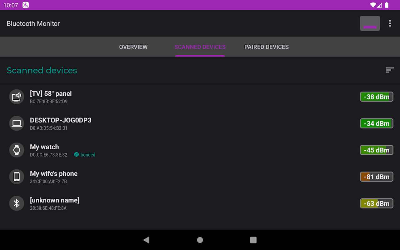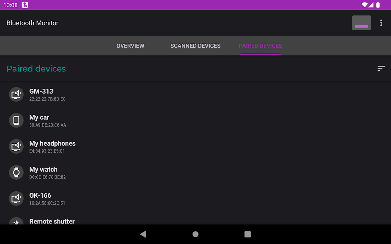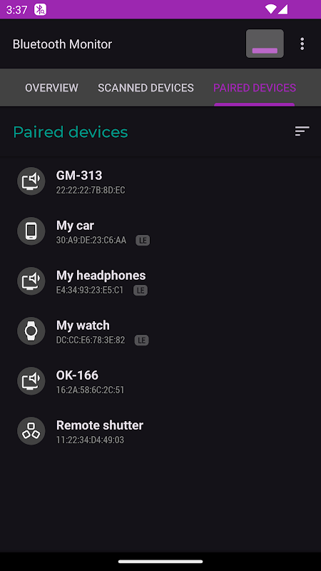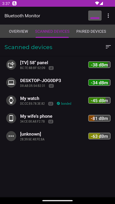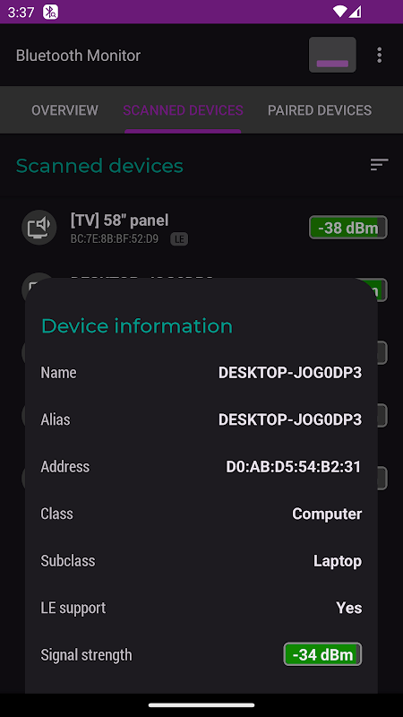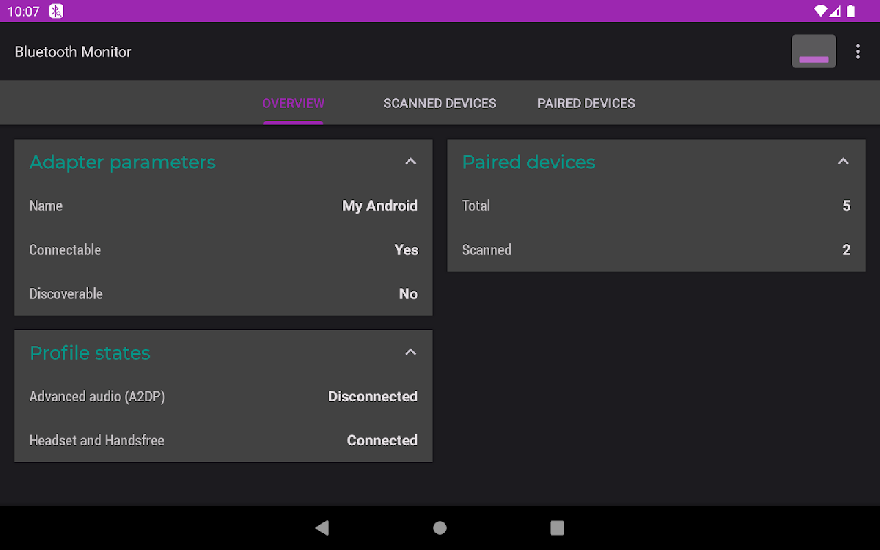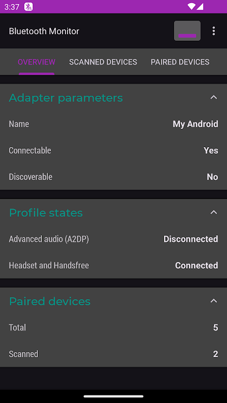 Monitor Bluetooth menampilkan data tentang perangkat Bluetooth di sekitarnya. Ini juga menampilkan daftar perangkat berpasangan (terikat) dan status koneksinya.