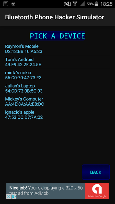 You can then select one of the devices from the list, a hacking progress bar will appear and you can show your friends that you are hacking into the phone!