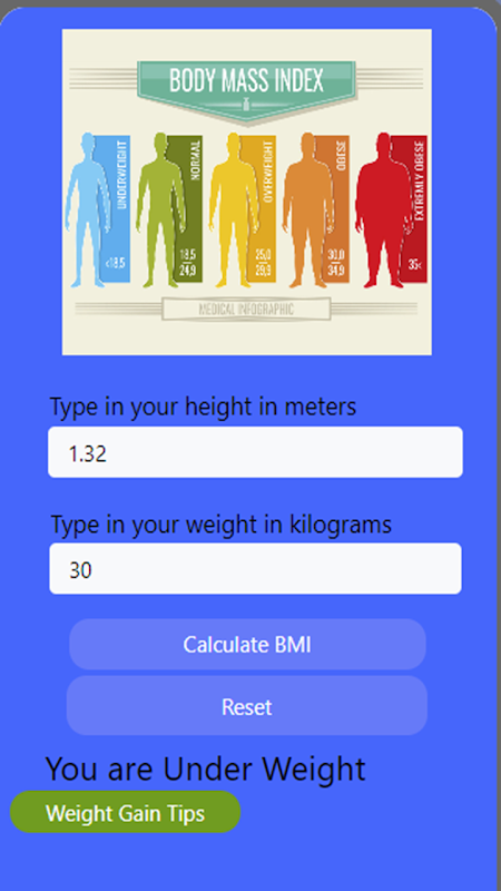 Dalam Kalkulator BMI ini, Anda memasukkan berat dan tinggi badan Anda, dan ini akan menghasilkan BMI Anda, apakah Anda kurus, kelebihan berat badan, bugar, kelebihan berat badan, obesitas, atau sangat obesitas. Anda kemudian dapat melihat tip penambahan atau penurunan berat badan tergantung pada BMI Anda.