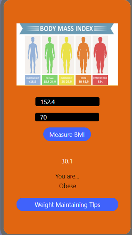 Aplikasi ini akan menanyakan tinggi dan berat badan Anda, lalu akan menghitung apakah BMI Anda normal, terlalu rendah atau terlalu tinggi. Bergantung pada hasilnya, ini juga akan memberi Anda tip berbeda untuk meningkatkan atau mempertahankan kondisi fisik Anda saat ini.