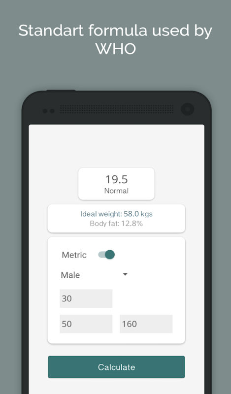 With the BMI Calculator you can check your body mass index, learn your ideal weight and body fat percentage. Calculations are based on the standard formula used by WHO.