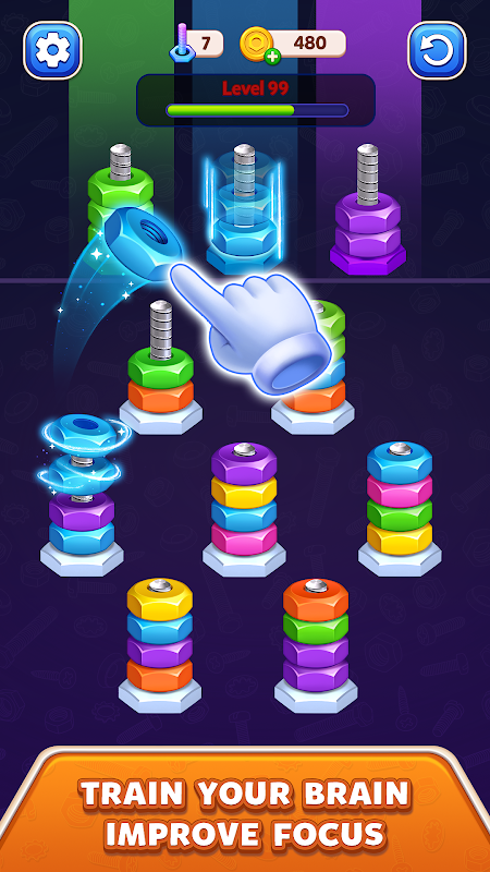 Bolt Sort: Stacking Puzzle adalah permainan menyortir yang sederhana namun adiktif! Tujuan Anda adalah menumpuk mur dengan warna yang sama ke baut yang cocok. Ikuti aturannya: