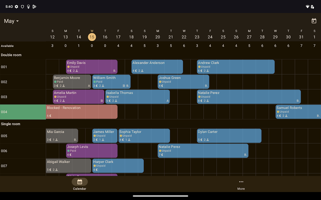 Tetap teratur dan selalu ikuti perkembangannya dengan fitur kalender kami yang nyaman. Kalender memberi Anda gambaran menyeluruh tentang urusan Anda, memungkinkan Anda memantau beban kerja dan ketersediaan properti dan objek Anda dengan mudah. Hanya dengan melihat sekilas, Anda dapat menilai status hunian, sehingga memudahkan perencanaan dan pengelolaan aktivitas persewaan Anda.