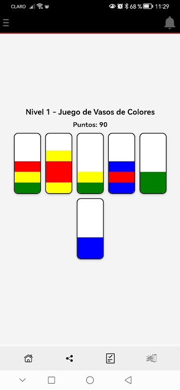 Akan ada beberapa gelas (atau tepatnya tabung reaksi xD), tugas Anda adalah mencocokkan cairan dengan warna yang sama! Anda dapat memindahkan air dengan warna berbeda dari satu gelas ke gelas lainnya hanya jika gelas lainnya kosong atau lapisan atas airnya sama warnanya dengan warna tempat pengambilan air.