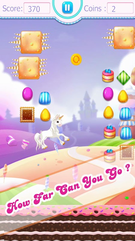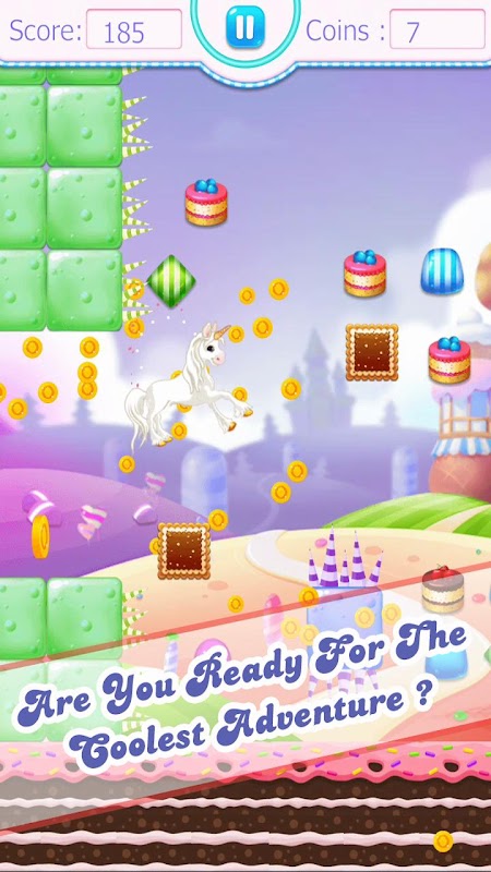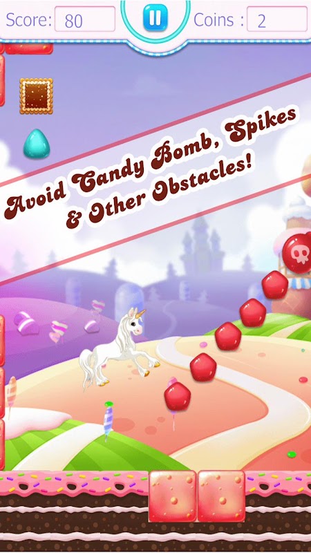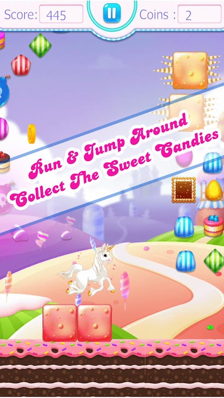 Are you ready to make a great journey with the Unicorn in Candy Land ? Help little pony to explore the wonderful world of Candy Land. Run and Jump to Collect Coins and Sweet Candies along the way, Avoid Obstacles! Share your score with friends!