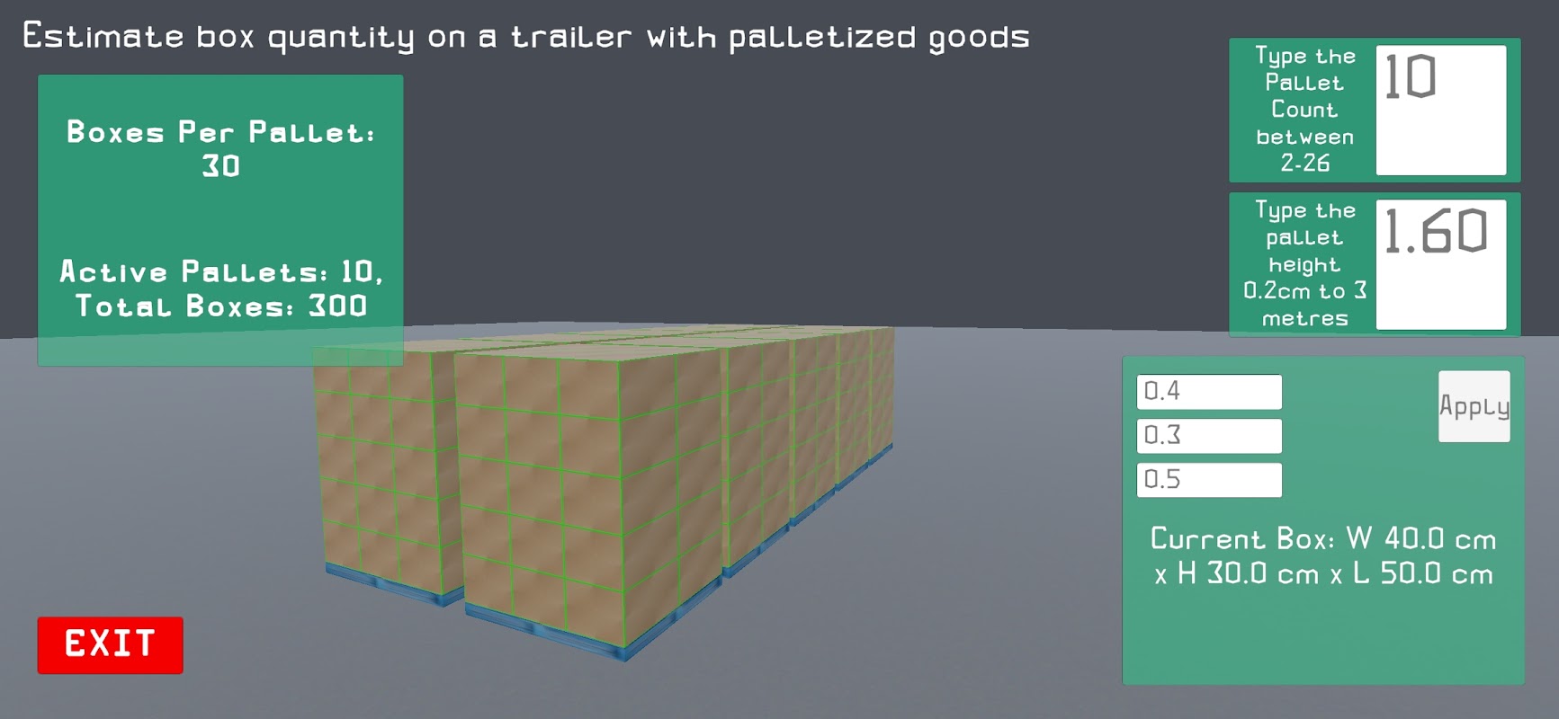 Hitung secara instan berapa banyak kotak yang muat di palet biru standar di berbagai lokasi pengambilan dan pengaturan trailer.