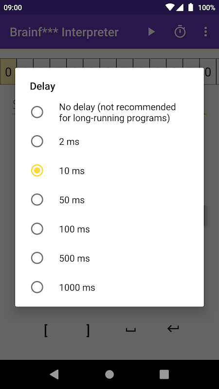 Aplikasi ini menampilkan tampilan langsung dari sel memori, yang memfasilitasi debugging kode dan mempelajari cara kerja bahasa dan penerjemah Brainfk. Anda dapat menambahkan penundaan untuk mengikuti proses langkah demi langkah.