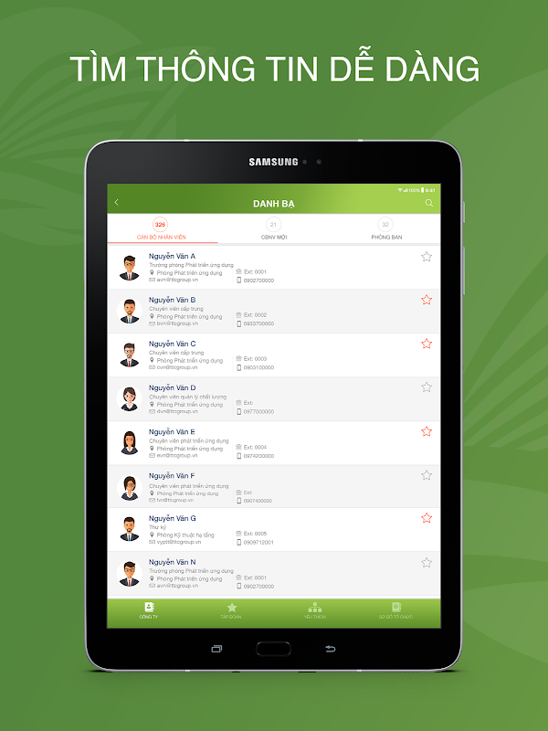 - Danh bạ: Hệ thống hỗ trợ tra cứu thông tin như: công ty, sơ đồ tổ chức, phòng ban, các thông tin các nhân.