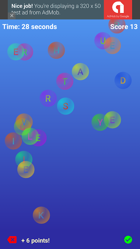 Touch bubbles to pop them. Pop bubbles to spell words. Spell words to score points. Score bonus points for longer words. The longer the word, the greater the bonus. Don't let your morning commute to school or work go to waste. Put your time on the bus or train to good use. Keep your mind sharp and have fun doing it. Want to have fun and relax? Try Free Play mode. No timers to mind, no words to memorize, just spell whatever word comes to mind and score. Do you need a warm-up challenge to get your brain ready for the work day ahead? Try Timed mode and keep trying to beat the clock. Spell a word to reset the timer, but as your score gets higher, the time you have to spell your next word gets shorter.