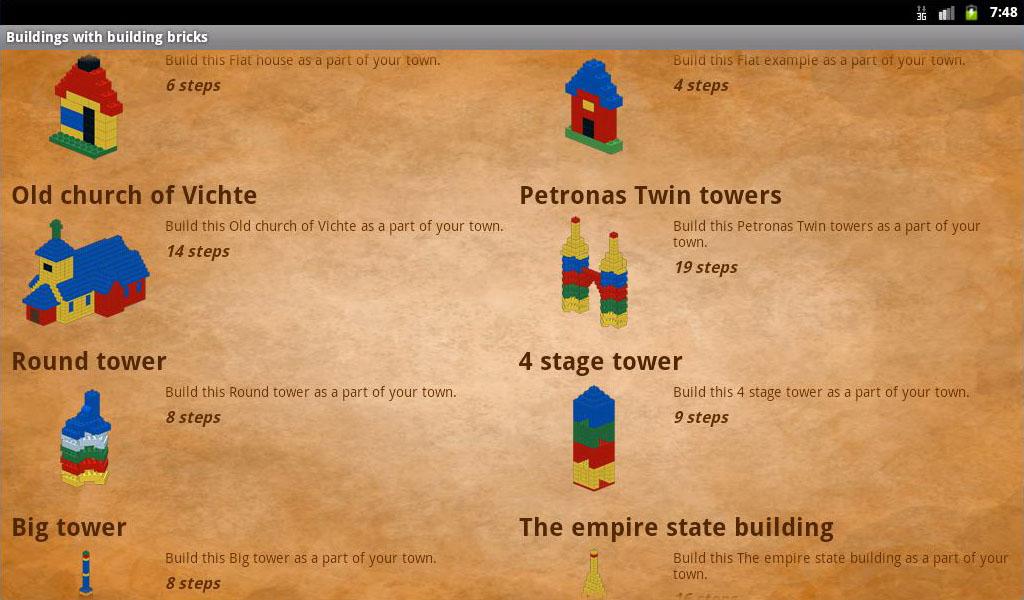 Create buildings with simple step-by-step instructions. Playing is fun and will add a lot the development of motoric skills. This puzzle game is really for all ages. Bring the bricks together and follow the color pattern. Have fun creating a house, tower, castle and even the empire state building.