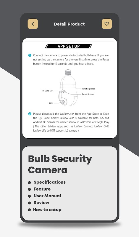 Apakah Anda sedang mencari informasi mengenai produk Kamera Keamanan LaView Bulb? maka aplikasi ini dapat membantu Anda mendapatkan informasi detail tentang Bulb Security Camera, cara menggunakannya dan memaksimalkan semua fitur yang ada. Dalam aplikasi panduan Bulb Security Camera ini Anda akan mendapatkan informasi seperti spesifikasi Bulb Security Camera, fitur dan detail produk, cara mengatur Bulb Security Camera, dan review informasi tentang produk.