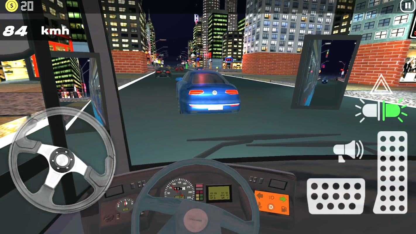 Dalam Game Mengemudi Bus ini, kendarai bus Anda di dalam kokpit, dengan tampilan orang pertama, di malam hari