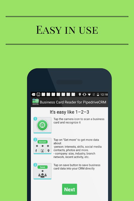Pembaca Kartu Bisnis untuk Pipedrive CRM adalah solusi termudah, tercepat dan aman untuk mentransfer informasi dari kartu nama kertas ke sistem CRM menggunakan kamera smartphone Anda. Ambil gambar kartu nama dan aplikasi akan memindai dan langsung mengekspor semua data kartu langsung ke CRM Anda. Selain itu, aplikasi ini akan membantu Anda mempelajari lebih lanjut tentang calon klien, mitra, atau kolega. Ini adalah salah satu aplikasi terbaik untuk sistem CRM.