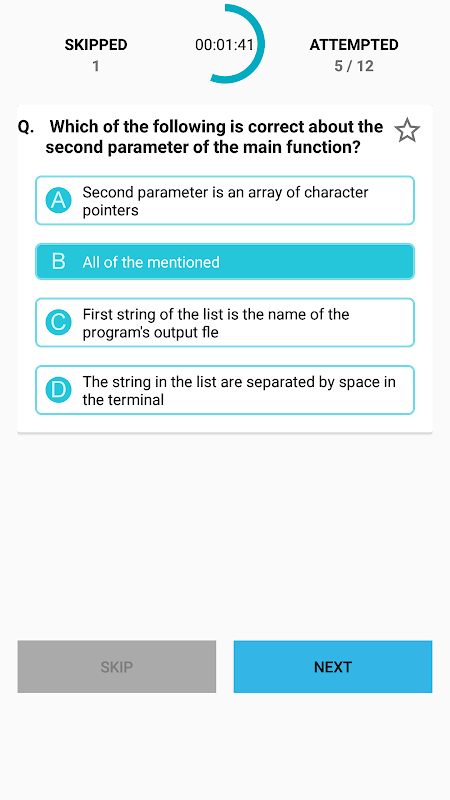 Kuis soal pilihan ganda adalah fitur ikon dari aplikasi Pemrograman C ++. Ini adalah fitur unik, berbeda dari aplikasi lain dengan aspek berbeda. Fitur Kuis soal pilihan ganda membantu untuk menguji keterampilan pengguna dalam lingkungan simulasi nyata. Fitur Kuis MCQ memberikan kontrol total kepada pengguna untuk mengkonfigurasinya sesuai pilihannya seperti jumlah mcq, jumlah menit, tingkat kesulitan, mcq acak, tanda negatif dll