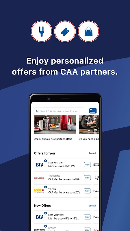 Anggota CAA dapat mengambil keuntungan dari penghematan instan atau mendapatkan CAA Dollars® di lebih dari 124.000 lokasi mitra Rewards di seluruh Amerika Utara. Dengan begitu banyak peluang untuk disimpan, mudah melacak semua penawaran favorit Anda di aplikasi. Aplikasi CAA Mobile yang baru menyatukan semua manfaat ini di satu lokasi sehingga mudah diakses.