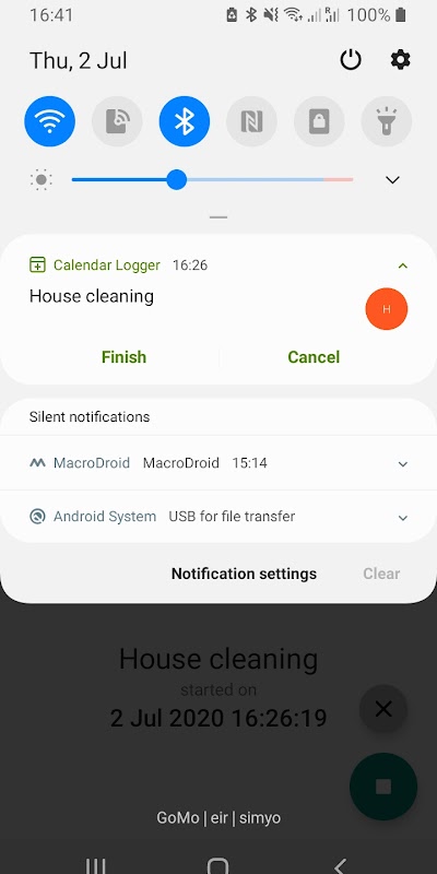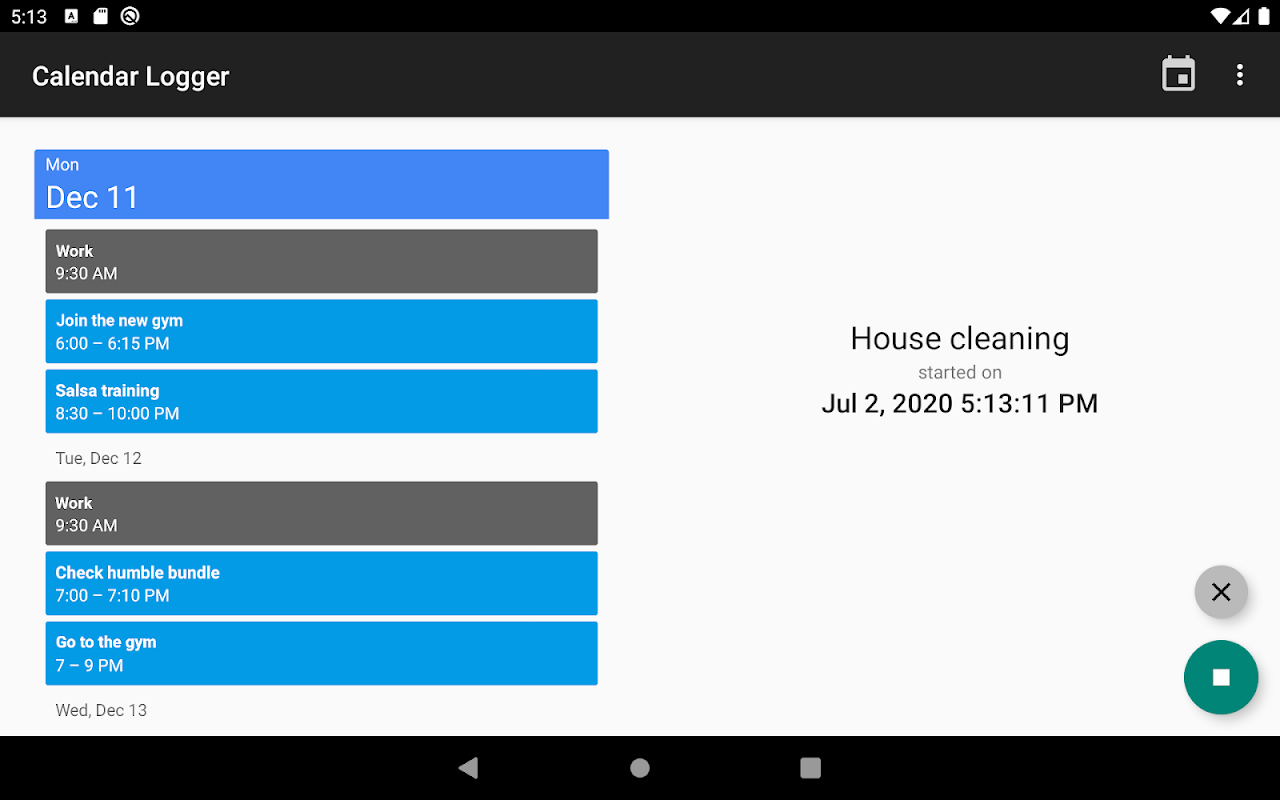 Tap one button when your activity starts, tap again when it ends. And your activity is now tracked in your Calendar application.